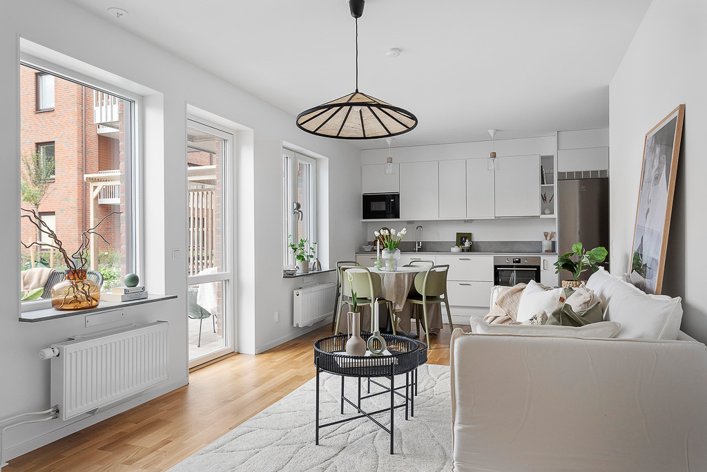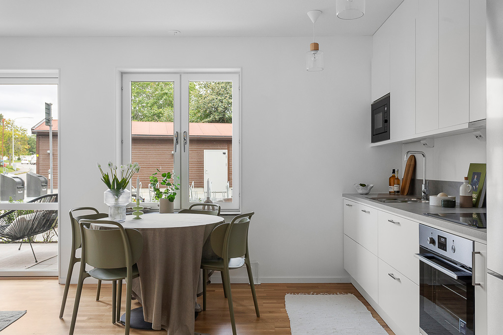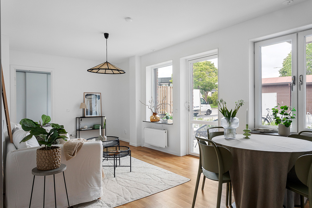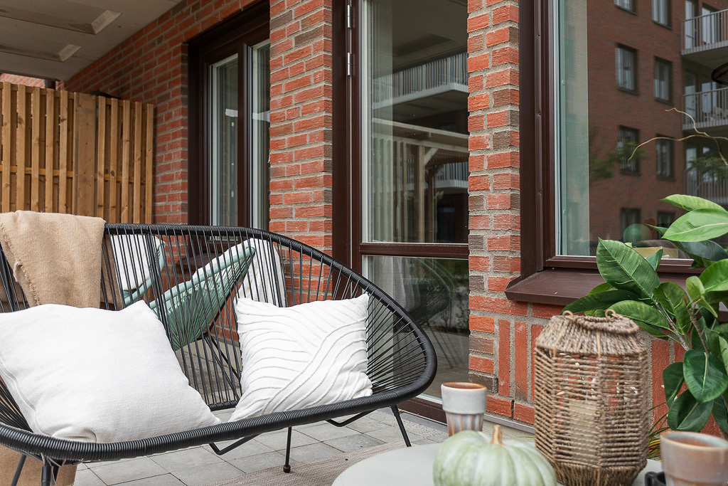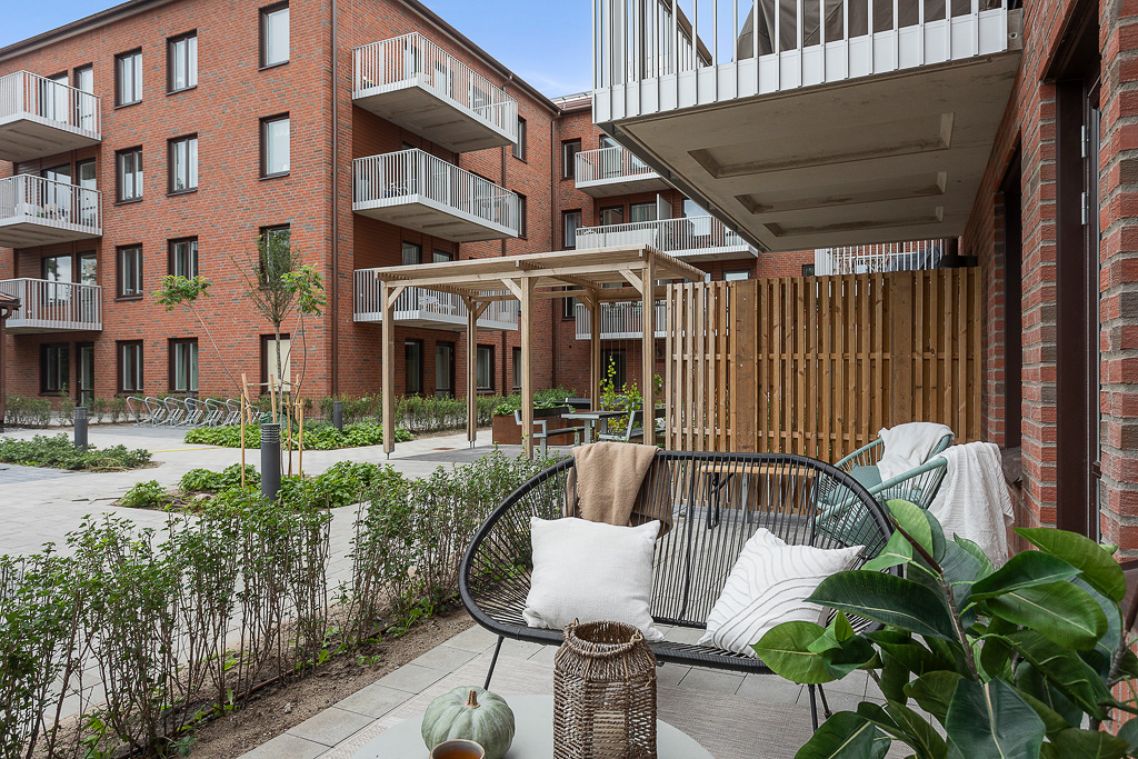 Nyproducerad och mycket fin tvårummare med öppen planlösning och mysig uteplats om ca 14 kvm mot den gemensamma gården! Genomgående fina materialval med ett kök i vitt med gott om förvaring, rymligt ljust badrum och ett sovrum med skjutdörrsgarderob och plats för en stor dubbelsäng. Den stora uteplatsen nås från kök/vardagsrum och har gott om utrymme för utemöblerna. Fint badrum med bl a komfortvärme, kommod, duschhörna och kombimaskin. Vidare finns en bänkskiva, väggskåp och praktisk torkställning. Plats för att hänga av ytterkläderna i hallen där det finns en hatthylla och garderob.