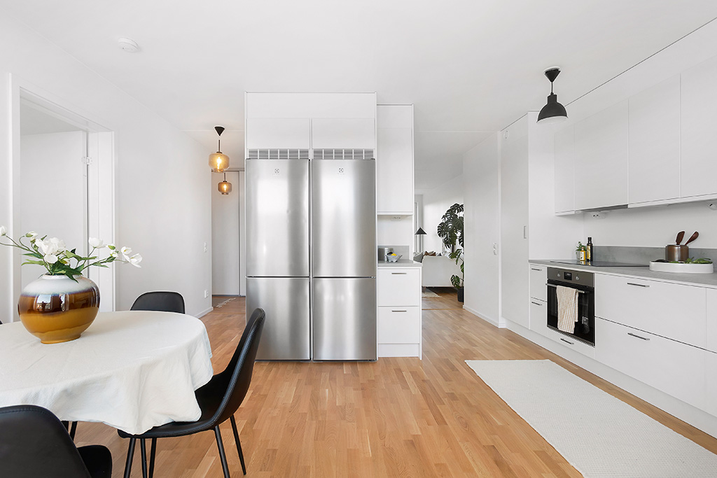 Köket levereras från Vedum och går i vita och gråa nyanser. Välutrustat med moderna vitvaror från Electrolux. Här finns dubbel kyl/frys, induktionshäll, ugn och diskmaskin. I köksdelen finns en matplats och här ligger även lägenhetens förråd. Från köket nås en av balkongerna som blickar ut över gatan och Bromstensstaden.