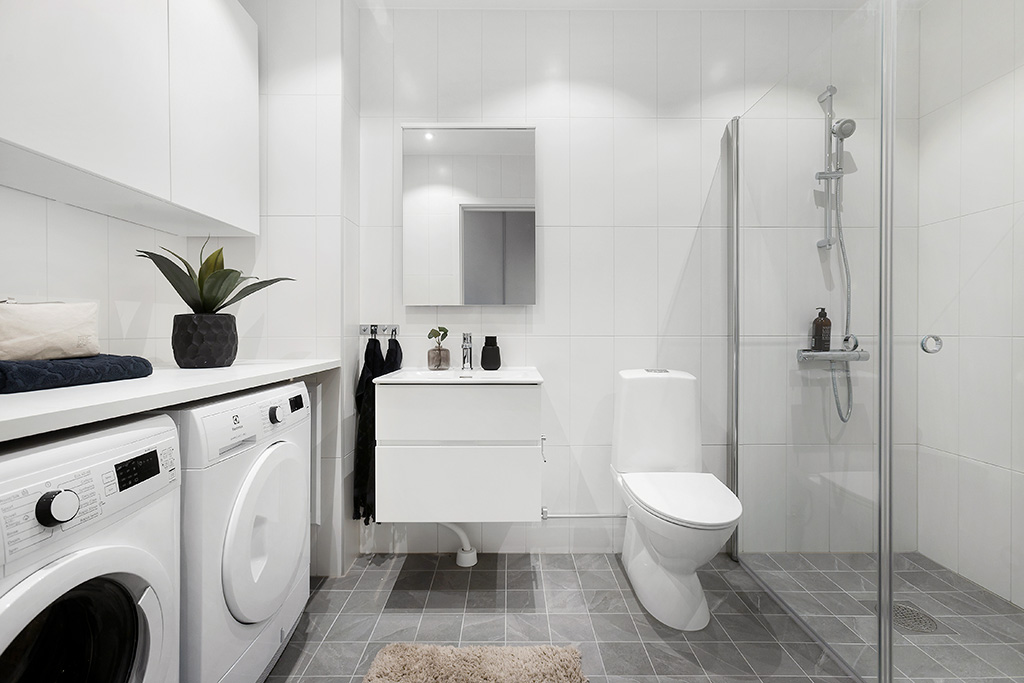 Hall med stor skjutdörrsgarderob. Anslutande badrum utrustat med tvättmaskin, torktumlare, handfat med kommod, wc samt dusch med glasvägg. Badrummet är helkaklat och går i vita och grå toner.