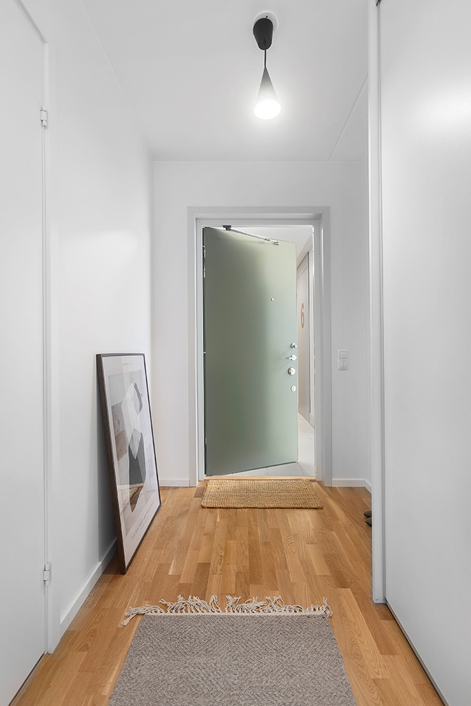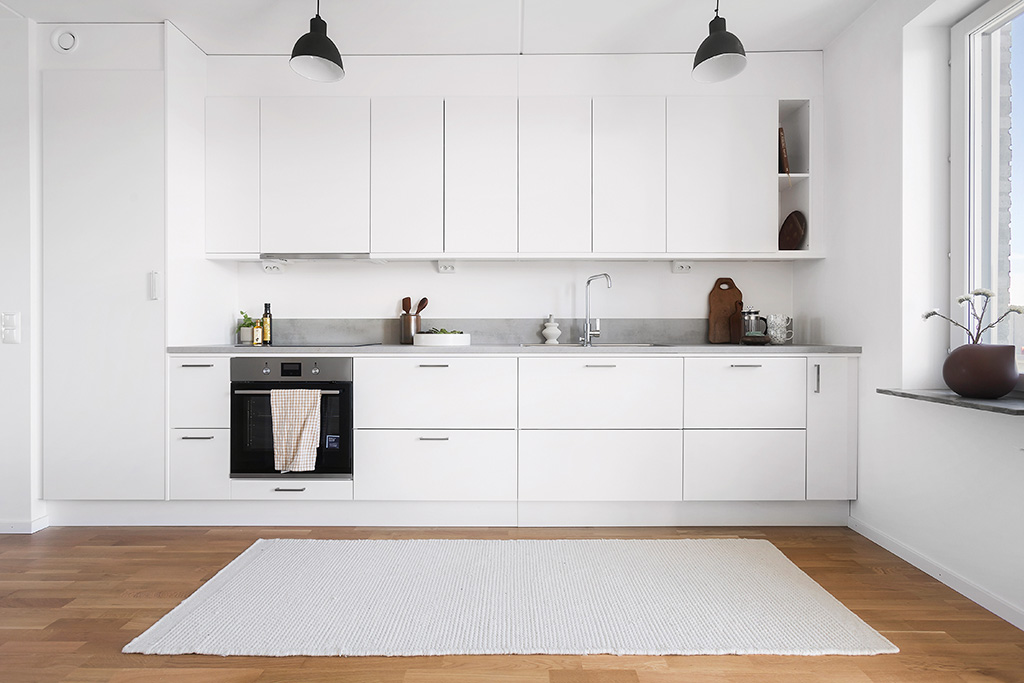 Materialvalen i lägenheten är gjorda med omsorg för att passa de allra flesta. Kök levereras från Vedum med vita luckor och laminatbänkskiva och bakkantslist i Chromix silver, vitvaror från Electrolux. Badrum med vitt kakel och vitgrått golv.