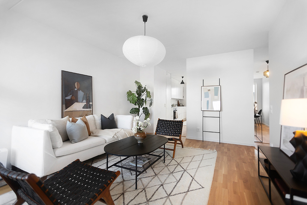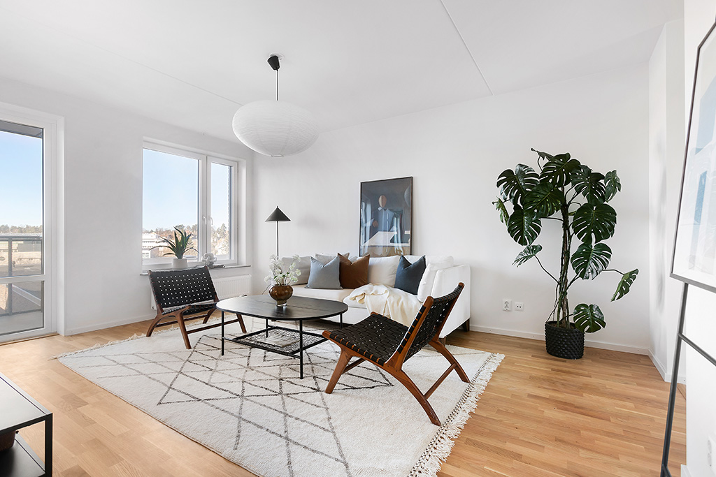 Vardagsrummet är lättmöblerat och här ryms soffgrupp, tv-möbel och övrig möblering. Utgång till den andra balkongen, som ligger mot gården i sydväst, sker härifrån.